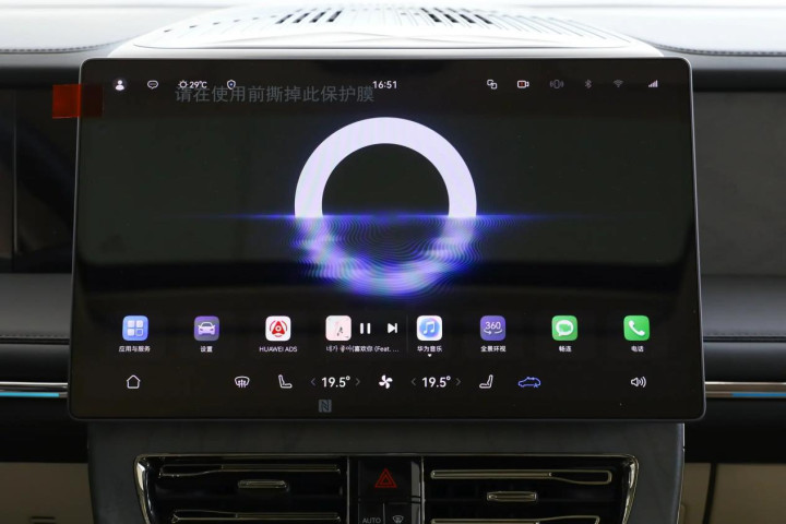 车内配12.3英寸液晶仪表和15.6英寸悬浮式中控屏,搭载HarmonySpace系统,高配配车还配有17.3英寸3K分辨率的后排吸顶屏,获莱茵低蓝光认证,支持三指飞屏和多屏联动。车机支持超级桌面,手机应用可一键投射车机,支持分屏显示导航与视频会议。语音交互搭载毫秒级响应引擎,支持粤语、四川话方言识别与连续指令识别,成功率非常高。